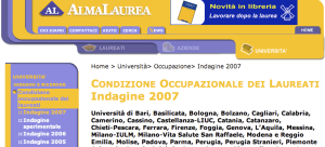 Un’altra indagine è stata effettuata nel 2007 sui laureati del 2006 (lauree triennali, specialistiche e vecchio ordinamento): puoi vedere i risultati nazionali in formato html o scaricare il file pdf (e apprezzare così il formato pdf rispetto all’html). Se ti interessano i dati per un singolo ateneo li trovi in un volume pdf (274 pagine).