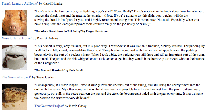 L’articolo che ho letto qualche giorno fa su Wall Street Journal parla di blog su cucina e cibo: Cook-Through Blogging. Te lo segnalo non tanto e soltanto per il tema ma anche perché è un buon esempio di cosa potrebbe essere una sitografia: titolo (del blog o sito con URL), autore, descrizione o citazione significativa, immagine (o miniatura).