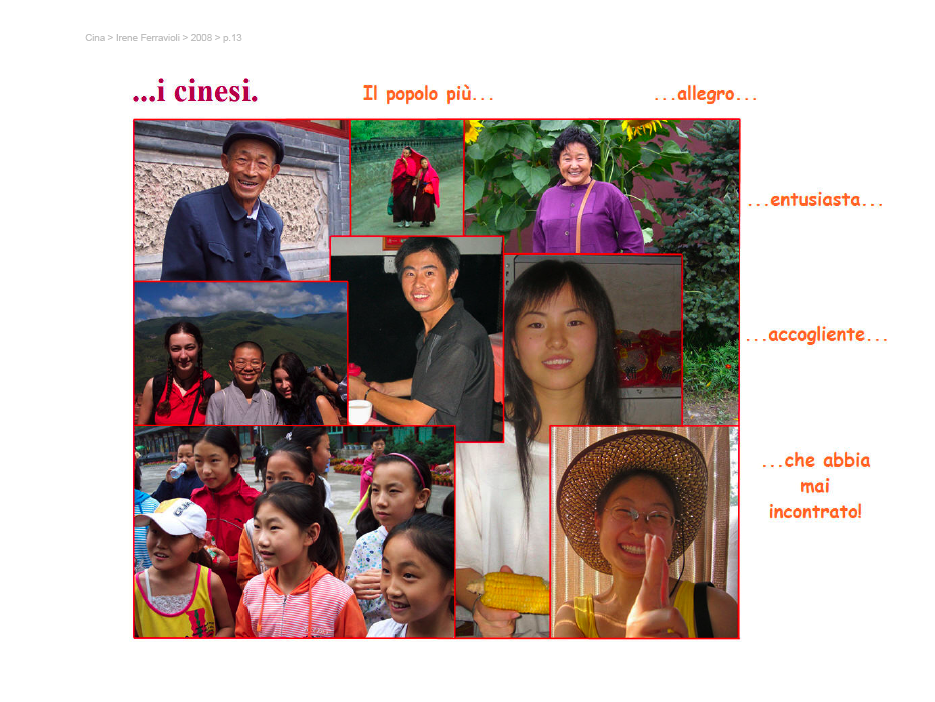 Irene Ferravioli frequenta il corso di laurea specialistica in Nuovi media e comunicazione multimediale e come tale non doveva sostenere l’esame di Editoria multimediale. Ma il tema del viaggio la attraeva e così, per puro divertissement ha deciso di realizzare un e-book sul suo viaggio in Cina. La versione che trovi qui è ridotta rispetto a quella originale ma è più che sufficiente a trasmetterti la passione con cui Irene ha vissuto e ora ricorda il suo viaggio. La pagina che vedi qui sotto ti dà un’idea della naturalezza con cui Irene sa giocare con l’immagine: