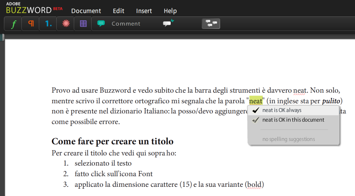 Buzzword di Adobe ti permette di scrivere testi on-line, condividerli e modificarli. I file che crei rimangono sul server remoto e per scrivere non devi installare alcun software. Ma c’è di più: rispetto all’incredibile complicazione di Word Vista, Buzzword è di una semplicità davvero foolproof !