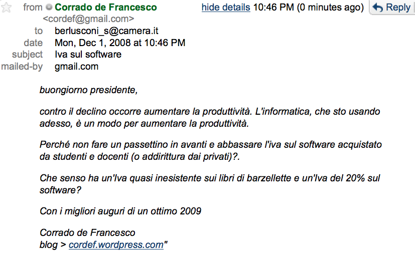 Ah già, sulla storia dell’IVA al 20% sul software avevo scritto una mail lo scorso anno a Prodi (→ post Regali di Natale): adesso la rimando a Berlusconi, vediamo un po’ se risponde…