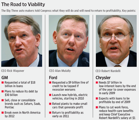 Martedì 3 dicembre gli amministratori delegati (CEO = chief executive officer) di Ford, General Motors e Chrysler sono andati a Washington per supplicare aiuto. Non è detto che ottengano la montagna di soldi (34 miliardi $) che chiedono. Se fossero tre aziende italiane sappiamo bene come andrebbe a finire: Alitalia docet. Quello che è certo per le tre aziende automobilistiche USA è una brutale cura dimagrante: hanno già licenziato decine di migliaia di dipendenti e altri drastici tagli sono in arrivo.