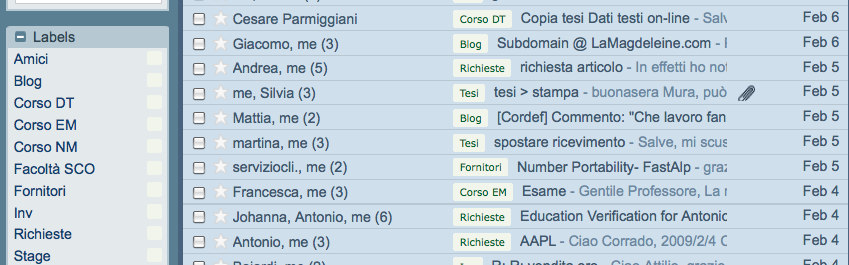 Una volta definite le etichette e attribuite le stesse alle nostre mail, con un clic su un label selezioniamo tutte le mail così classificate: una gran bella comodità!