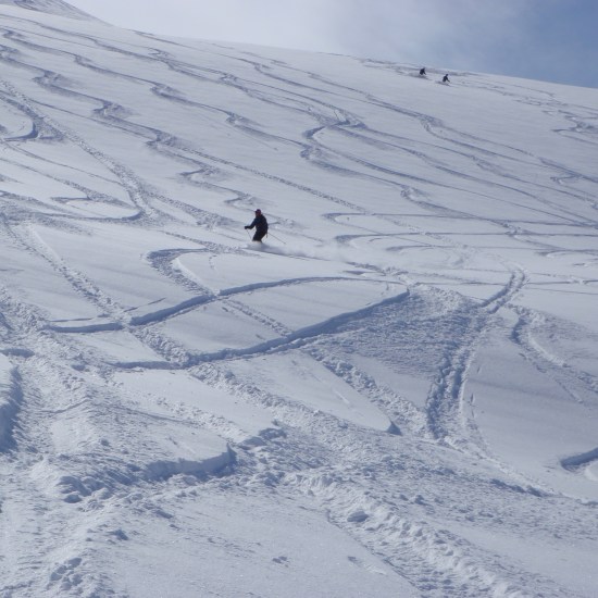 il 24 aprile ha nevicato tutto il giorno: bella temperatura invernale (-15 a 3500 m.) che ha mantenuto la neve in condizioni splendide il giorno dopo. Ieri (sabato 25) con Lorenza e Alberto (della già mitica Locanda4 → sito web) opening soon → post Blog o sito per la nuova locanda?) siamo saliti a Plateau Rosa con una mezz’ora di ritardo sulla tabella di marcia: mannaggia! All’uscita dalla cabina strapiena, via di corsa sotto i cavi e giù per la Spazzatura già transitata ma comunque magnifica. Scendendo abbiamo incrociato Luca che sciava da solo: si è aggregato ed è stato un piacere averlo insieme. Canali Sx e Dx belli: neve alta ma abbastanza leggera. Gobba di Rollin leggermente ventata ma quasi deserta. Canale del Teodulo pistato ma comunque divertente. Un’ultima discesa da Rocce Bianche e poi alla macchina. Peccato aver superato i cinquanta! Bianca li ha ma non li dimostra e finisce che io passo per suo zio.