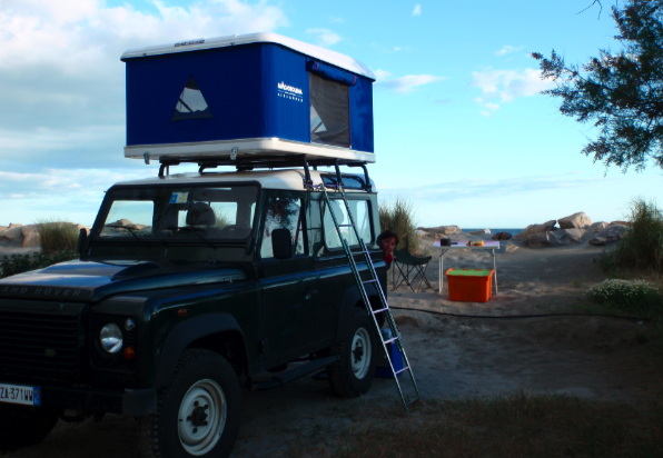 sul Defender abbiamo montato una Maggiolina Airlander: una tenda che si alza a manovella. Sembrava un bel prodotto: lo è davvero anzi è uno splendido prodotto! L’abbiamo testata al mare sotto un vero diluvio: non ha fatto una piega! Niente capillarità e, malgrado il vento per tutta la notte, dalle finestrine di aereazione non è entrata neanche una goccia.