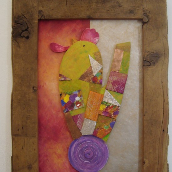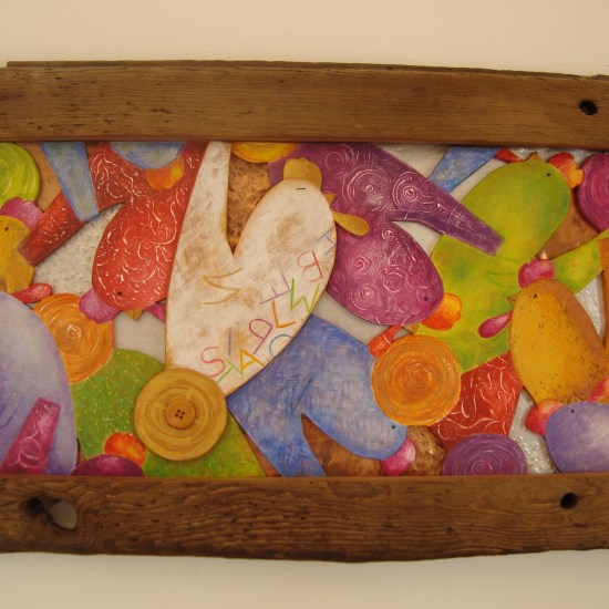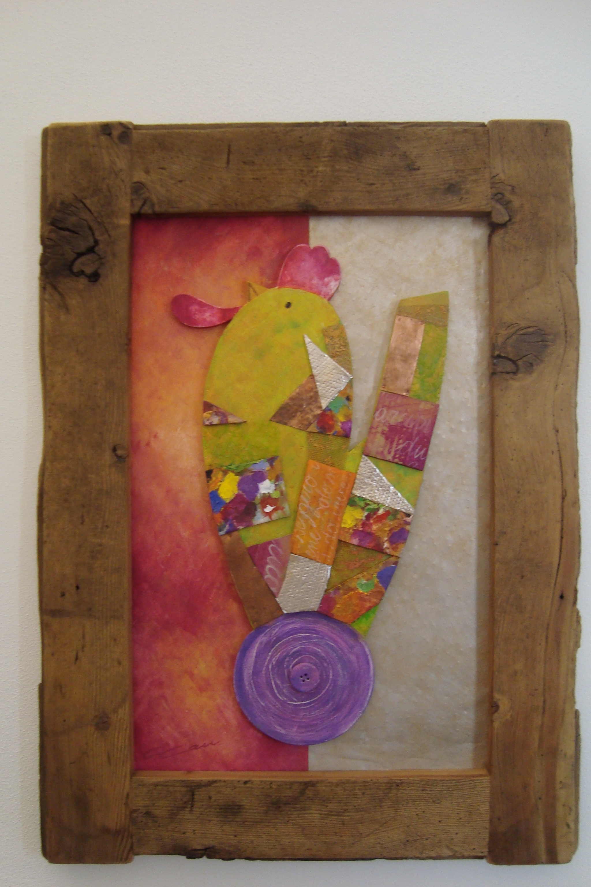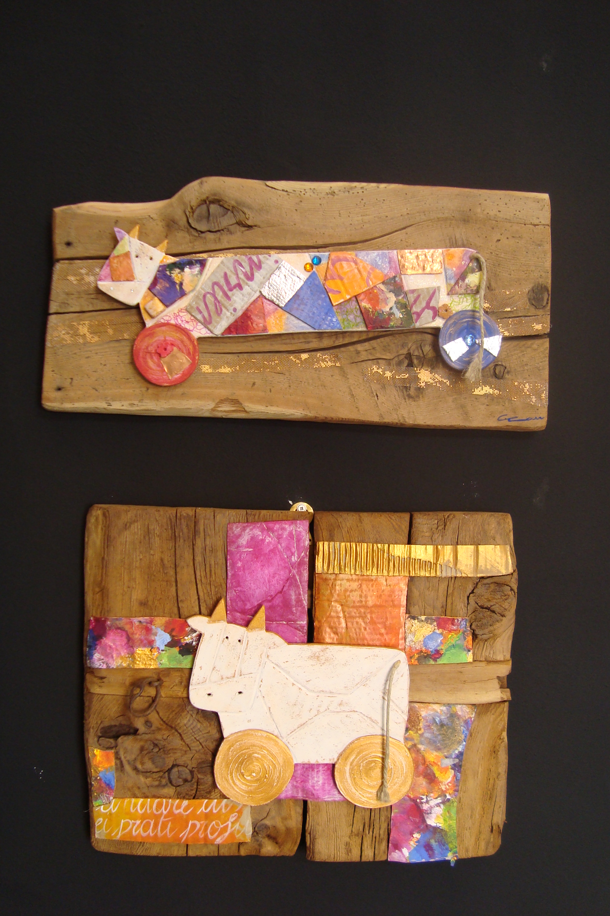 Il Forte di Bard è una possente struttura difensiva dei secoli scorsi che sbarra l’accesso alla val d’Aosta. Da qualche anno il forte è rinato: ospita il Museo delle Alpi e dispone di spazi per mostre ed eventi (→ sito web). Nelle antiche scuderie del forte si svolge sino al 23 agosto una mostra di Vito Mele e Cristina Cancellara (→ comunicato stampa). Cristina è, come noi, una trapiantata in valle: da un po’ di anni vive e opera a Valtournenche in uno studio laboratorio nella piazzetta del paese davanti alla chiesa. A Bard Cristina espone le sue opere delicate e ricche di colore: galli, mucche, asinelli tagliati nel legno e poi posati su assi ricche di patina e anni (bois collage).