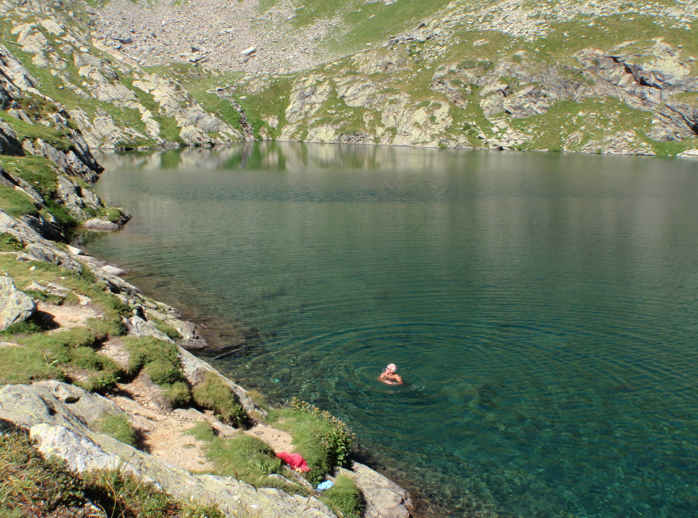 Bello il lago, strepitosa la vista sul Glacier Chateau Blanc e verso il Ruitor. Come si poteva evitare di fare il bagno in un’acqua trasparente e gelida? Detto fatto: