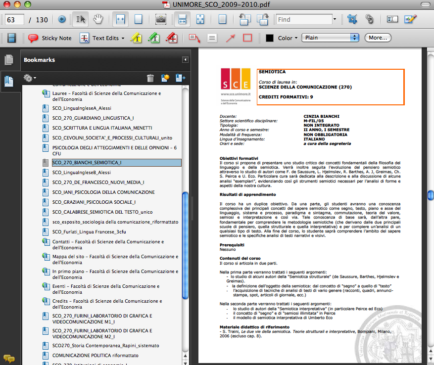 usando Adobe Acrobat è un processo semplice e foolproof come sa qualsiasi studente che abbia seguito il corso di Nuovi media (→ Lezione Strategie di ricerca) o di Editoria multimediale (→ Lezione Catturare le pagine web con Acrobat). Non capisco quindi perché non lo si faccia per i programmi degli insegnamenti di un corso di laurea. Mi riferisco in primis al corso di laurea di Scienze della comunicazione: mettere insieme i programmi in un solo file pdf permette di avere un quadro di insieme, di confrontare tra loro i programmi e di aggiungere note e commenti (ricercabili). Un file cumulativo del genere dovrebbe essere molto utile non solo a chiunque abbia compiti di direzione e organizzazione ma anche ai semplici utenti.