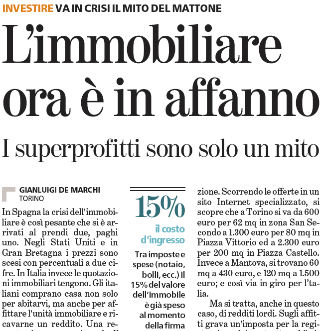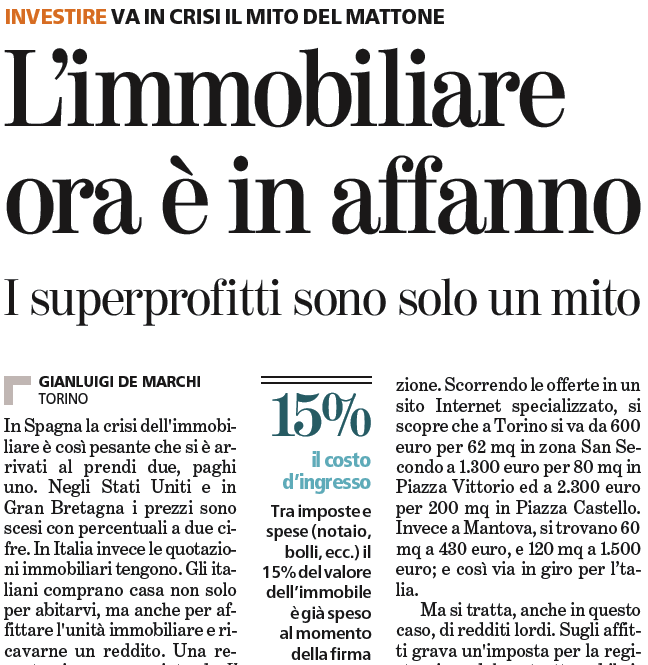 Ho sempre pensato che le cose andassero così: un bravo giornalista scriveva un bel pezzo su un importante quotidiano e poi lo stesso pezzo dava lo spunto a infiniti copia e incolla su vari blog. Ma questa non è la regola. Può invece capitare l’inverso. Mi spiego meglio: ieri, lunedì, ho letto la Stampa e TuttoSoldi (le sue pagine dedicate all’economia). Sono stato incuriosito da un articolo L’immobiliare ora è in affanno a firma di Gianluigi De Marchi. Bell’articolo! Completo e interessante. Andrebbe letto da tutti quelli che, santa ingenuità, stanno pensando di mettere i loro risparmi nel mattone. Pensano cioè di comprare un appartamento, non per abitarci ma come forma di investimento. Sono così convinti della razionalità delle loro scelte che dimenticano due fatti ben citati nell’articolo: