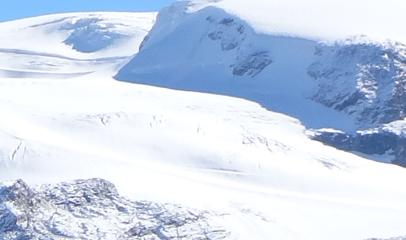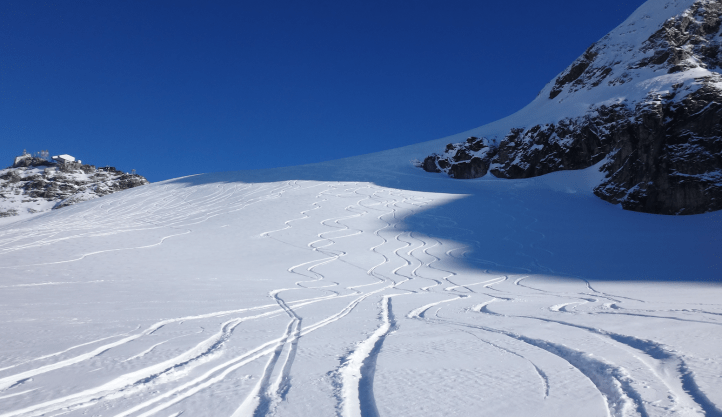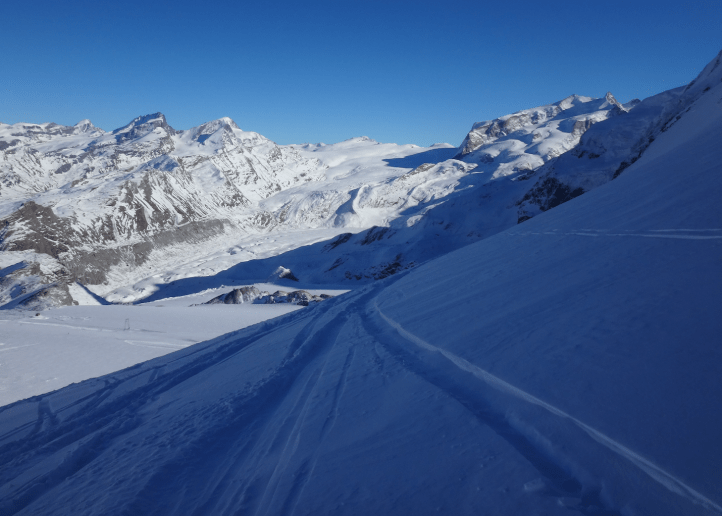 A Plateau optiamo per il “sottogobba”, una discesa bella anche se breve sotto la Gobba di Rollin. Un gruppo di ragazzotti con le tavole è appena sceso in mezzo ai crepacci centrali al momento coperti… Sono di fuori e non sanno come quei crepi erano aperti a metà ottobre…