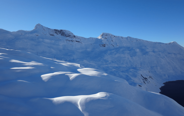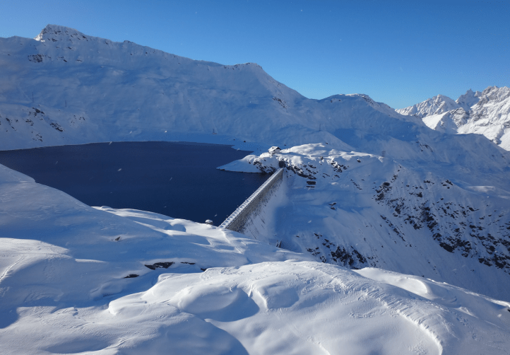 Salendo con le cabinette a Cime Bianche Laghi diamo un’occhiata al Goillet e al “sottodiga”: il vento da sud ha accumulato neve, in basso ci sono sassi scoperti e la discesa sotto la diga può (deve) aspettare.