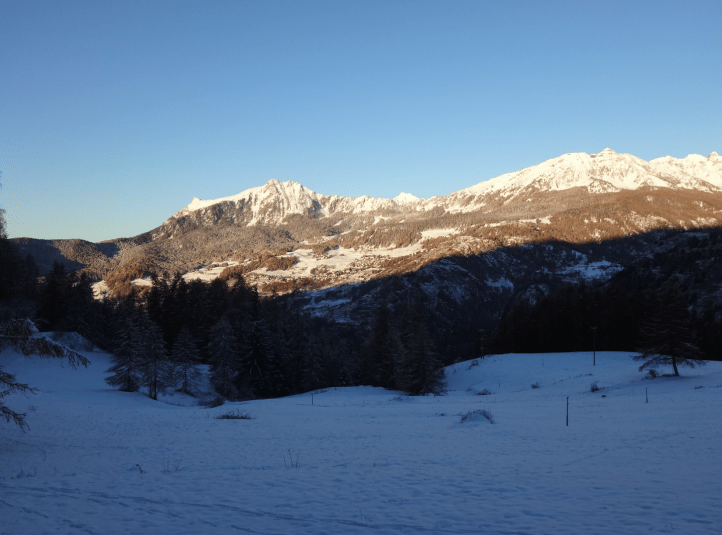Passa qualche giorno e oggi la giornata è splendida: appena sotto zero a casa, ma di sicuro sopra zero a Torgnon che, di fronte a noi, alle 8 è già al sole.