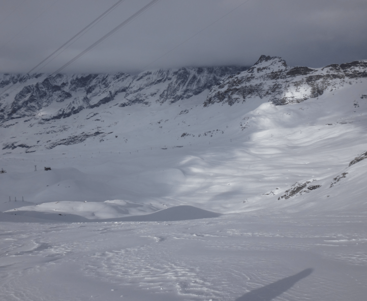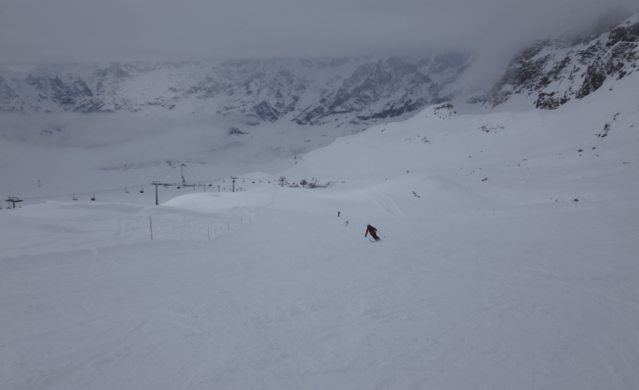 Funivia, altra discesa, funivia, ecc. Poi scendiamo in Svizzera a vedere com’è da loro. Il Furggletscher ha ricevuto meno neve e si può scendere solo per poco visto che a Furgg non fanno risalire.