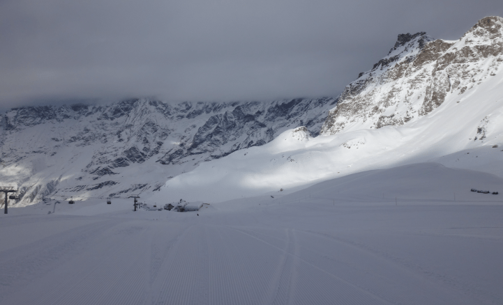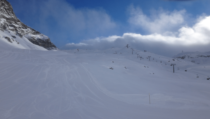 A Cervinia la gente è poca, anzi pochissima. Il tempo è nuvoloso e fa freddino (-15° a Plateau Rosa) ma in compenso la neve è bella.