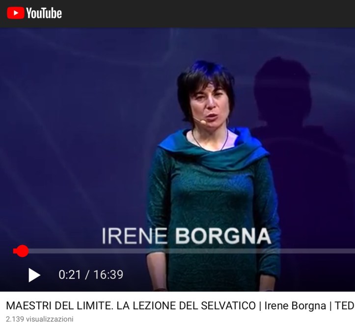 Su Irene Borgna, tra i vari video, ti segnalo questo intervento di un quarto d’ora fatto nel gennaio 2019 a Trento nell’ambito dei TED Talks: parla del ritorno degli animali selvatici in montagna (lupo, orso, ecc.) e del significato profondo che porta con sé.