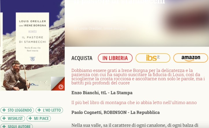 Louis Oreiller è un montanaro della valle di Rhemes: ha più di 80 anni ed è sempre vissuto in quella valle che non ha mai smesso di amare. Irene Borgna è invece una guida naturalistica di una trentina d’anni con un dottorato in Antropologia Alpina. Hanno avuto la fortuna di incontrarsi e così la vita di Louis è diventata un libro magnifico: Il pastore di stambecchi.