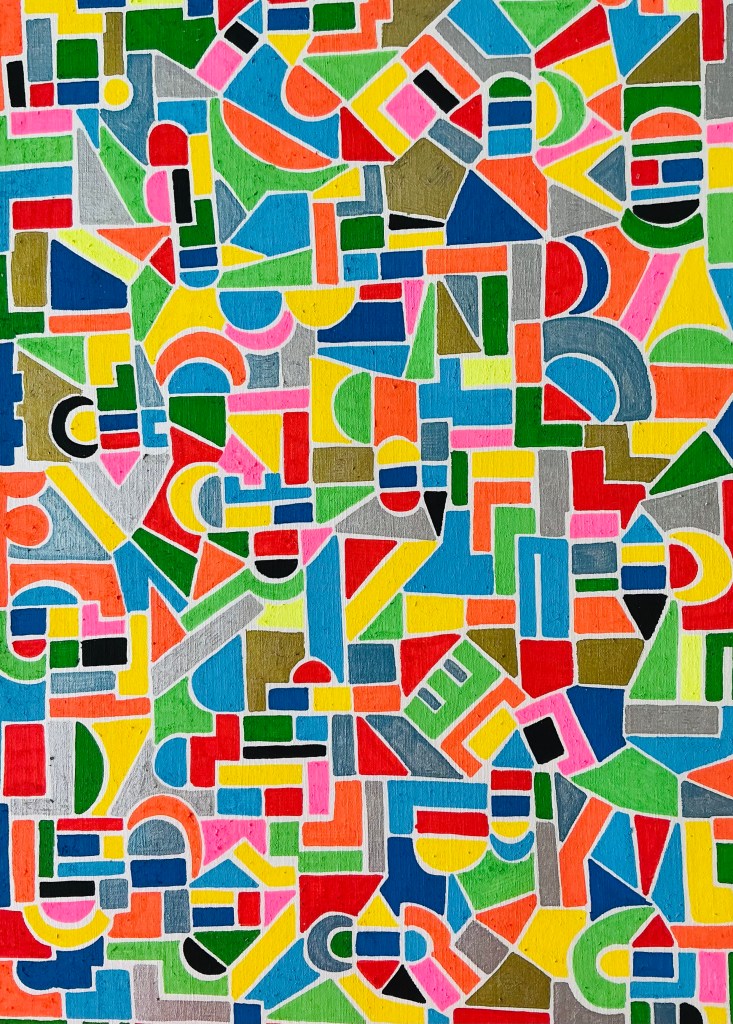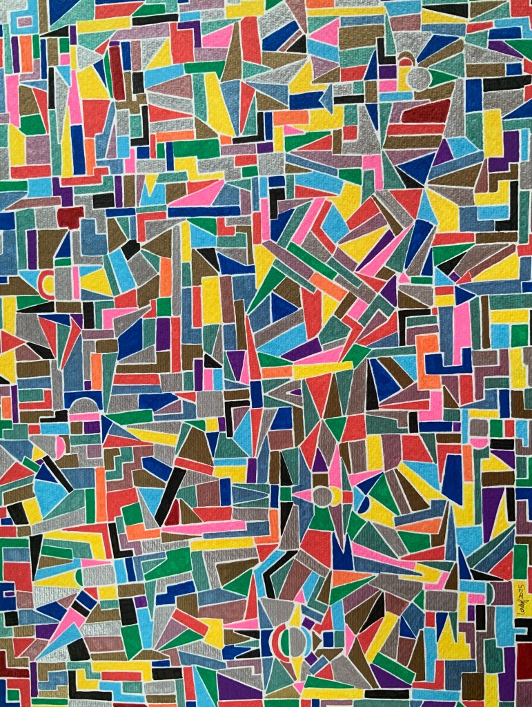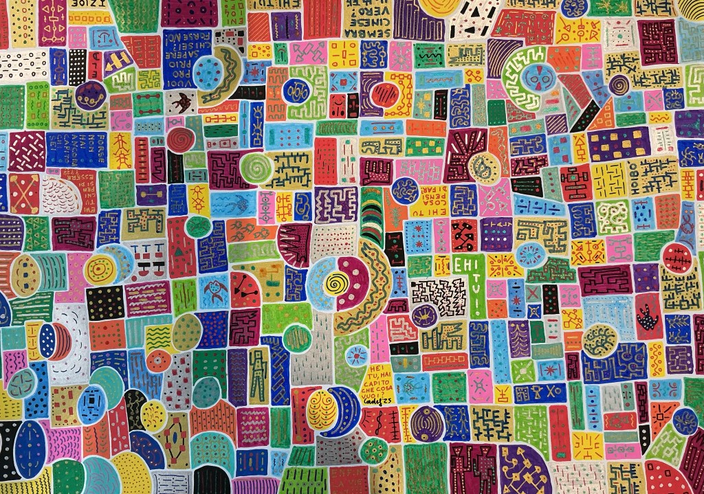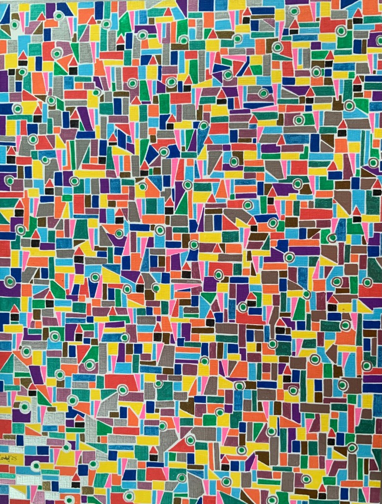 Quelli che vedi sono acrilici su carta 30 x 40. Rispetto agli acrilici precedenti questi sono costituiti da figure piccole. Diciamo che avrei voluto realizzare dei mosaici ma, per comodità, mi sono accontentato di simularli su carta.