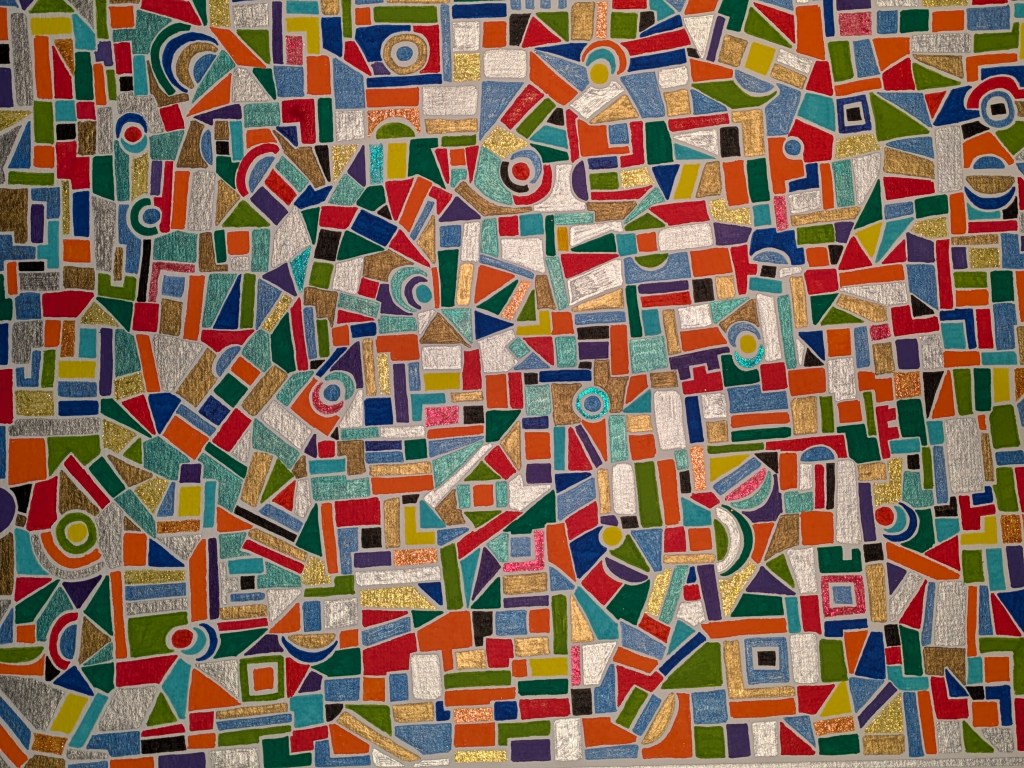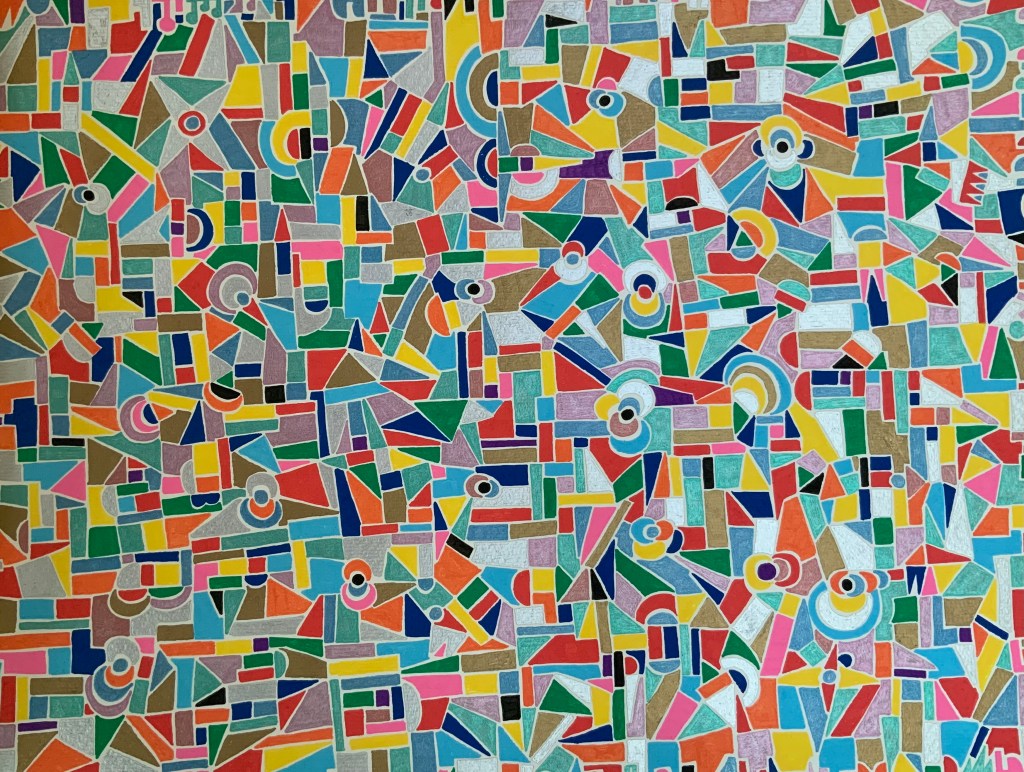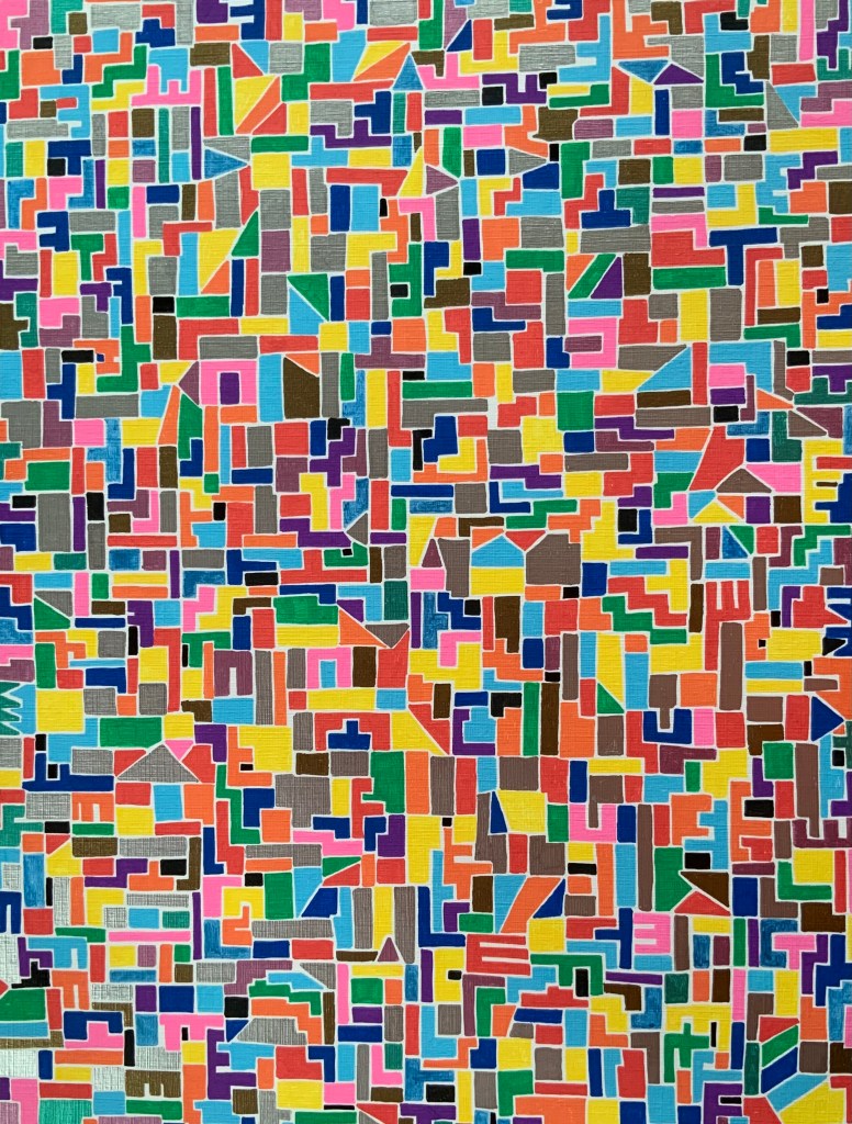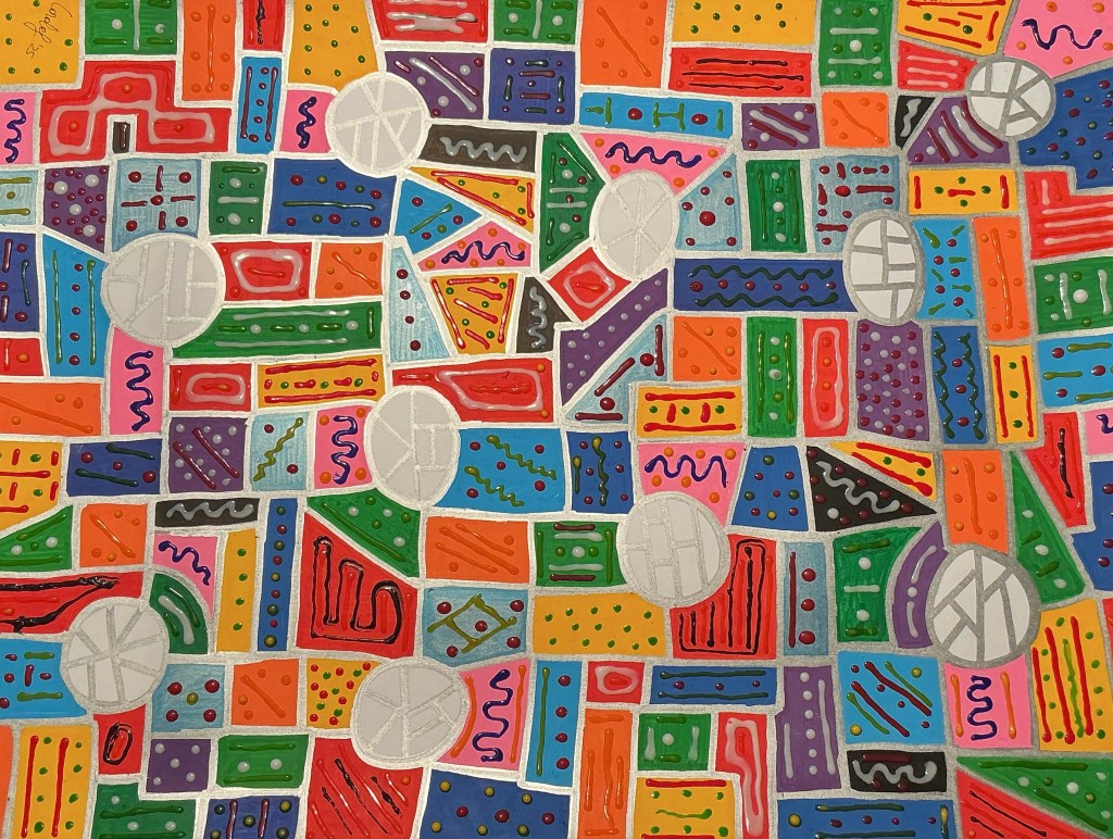 Quelli che vedi sono acrilici su carta 30 x 40. Rispetto agli acrilici precedenti questi sono costituiti da figure piccole. Diciamo che avrei voluto realizzare dei mosaici ma, per comodità, mi sono accontentato di simularli su carta.